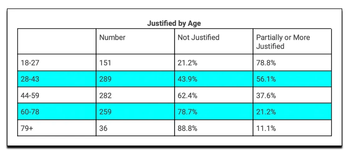 Among the 18-27 age group, almost 80 percent of respondents said they thought Thompson’s murder was at least partially justified. That figure dropped to just over 11 percent in the 79+ age group.