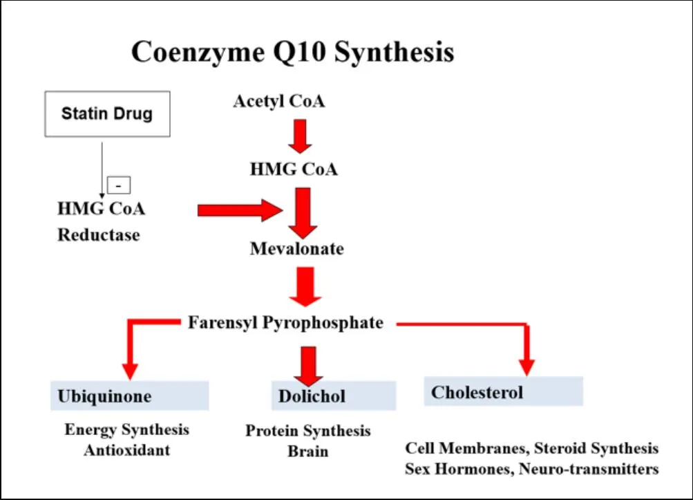Statins are a class of drugs called HMG-CoA reductase inhibitors. HMG-CoA reduction inhibitors inhibit the Mevalonate Pathway which initiates many life-sustaining processes and products including cholesterol. If you believe that a new symptom you have may be related to the statin drug you are taking, you msy be quite right. When the HMG-CoA is inhibited by statins, as shown in the first image by Q10 Facts below, we can see that the synthesis of ubiquinone (CoQ10), dolichols, and cholesterol are all reduced; that includes anything they synthesize, as well. The inhibition of each of them has serious adverse effects on health.
