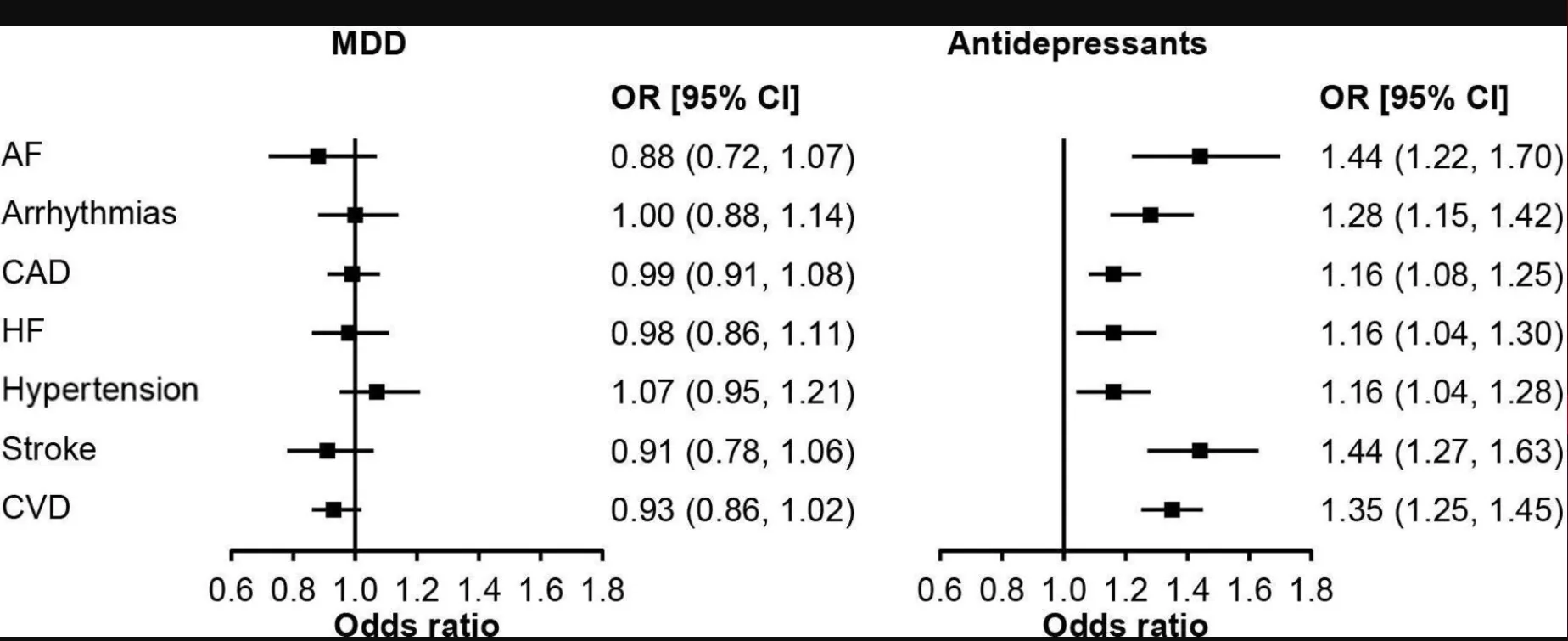 Our ... analysis demonstrated that the use of antidepressants is correlated with the elevation of respective risks across all cardiovascular conditions. This includes arrhythmias (OR: 1.28), atrial fibrillation (OR: 1.44), coronary artery disease (OR: 1.16), hypertension (OR:1.16), heart failure (OR: 1.16), stroke (OR: 1.44) and entire CVD group (OR:1.35).