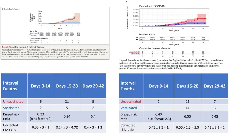 Unlike the authors, however, I did not discard the data from the first two weeks as “a temporary increase in events among unvaccinated,” which was no more than wishful thinking. Rather, I assumed that biases that were operating at that time did not miraculously vanish.