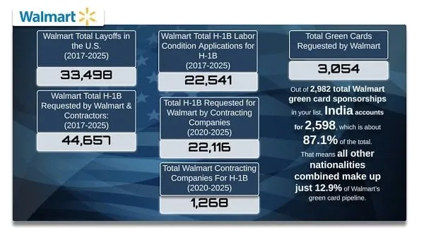 The numbers tell a stark story. Between 2017 and 2025, Walmart laid off more than 33,000 U.S. workers while simultaneously driving nearly 45,000 H-1B visa requests through direct filings and contracting companies. The company's reliance on foreign labor is even more clear in its green card pipeline. Of the 2,982 total cases, 87.1% were for Indian nationals, leaving all other countries combined at just 12.9%. With over 1,200 contracting companies feeding H-1B workers into Walmart's tech operations, the data suggest a deliberate strategy: cutting American jobs while expanding dependence on a foreign workforce, overwhelmingly from India. This imbalance raises fundamental questions about Walmart's priorities and their impact on U.S. workers.