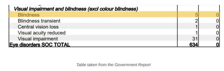 5 people are now blind and a further 31 have had their vision impaired. In total there have been 634 eye disorders reported so far. Imagine being confined to the same four walls for over a year and not being able to see family or friends. Then getting excited because you naively think an experimental “vaccine” is going to give you your life back and allow you to see them once more. But then leaving [you] without the ability to ever see anything ever again.
