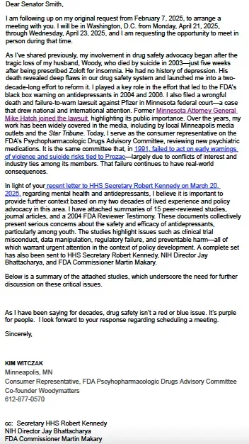 Below is a letter from Kim Witczak, a drug safety advocate – addressed to Senator Tina Smith. It requests a meeting to discuss mental health and antidepressant safety concerns, referencing Witczak’s personal experience, and attaching 15 studies highlighting issues like clinical trial misconduct and regulatory failures.