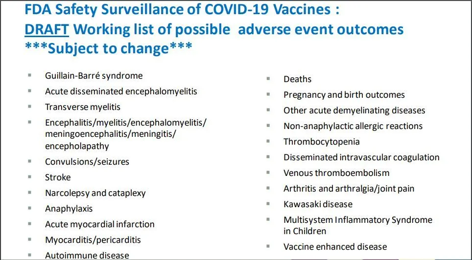 PIMS/MIS-C is not just an adverse effect of Covid-19, it is an expected adverse effect of the vaccine, included on the FDA’s draft list of adverse events to watch out for, which was presented at an FDA meeting on October 22, 2020. (See image below.)[32] This means that inoculating Israel’s children against Covid-19 will put 100% of the children at risk of PIMS, not just the very few who may suffer from it as a result of a Covid-19 infection. Even without seeing the data used by the anonymous doctor, it doesn’t appear that she was wrong in her analysis, as Brosh claims she was.