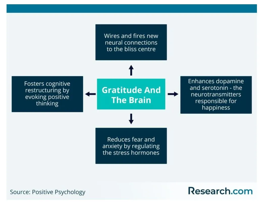 This kind of thinking leads to a release of serotonin and dopamine, chemicals in the brain that are associated with happiness and pleasure. Acknowledging gratitude also decreases stress hormones. The short-term result is a reduction in anxiety and an improvement in mood. In the long-term, regularly practicing gratitude may also lead to lasting changes in your brain, priming you to be more grateful going forward.