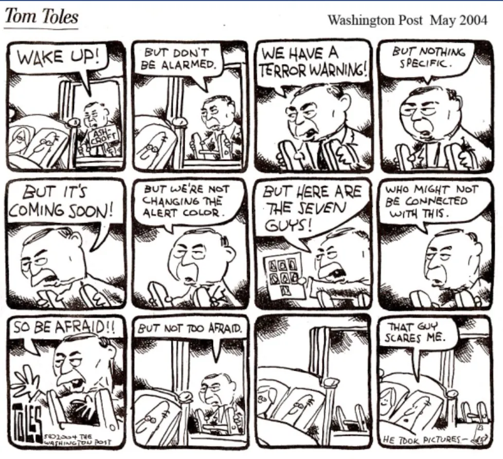 Not wanting to leave anything to chance, Nowak included cartoons in the PPT (below) directing the media on just how to do it. The top image is an original Tim Toles "terror warning" cartoon (page 14 in the PPT) and the bottom image is Nowak's "modification," turning it into an "influenza warning" (page 15 in the PT). Nowak wanted readers to be afraid of the flu just enough to get vaccinated, but not too afraid since they don't want everyone coming at once.